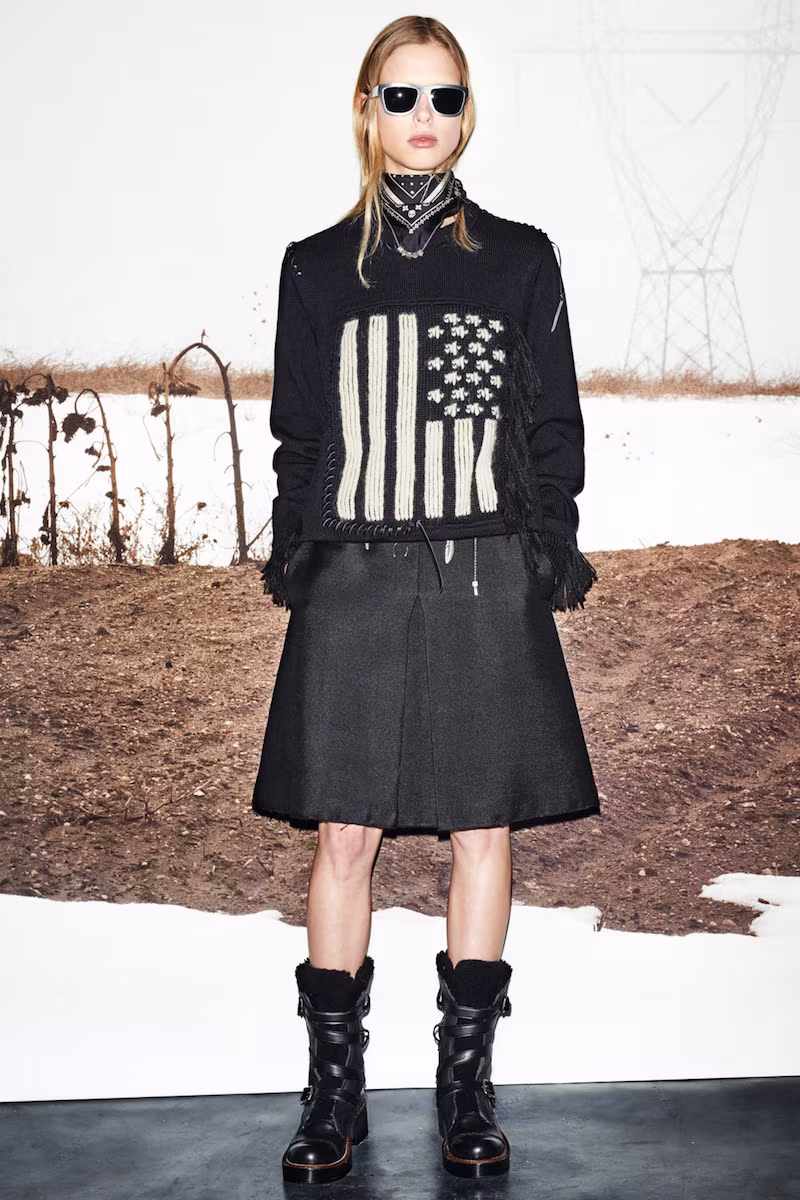 This Fall, Coach finding that balance outside of outerwear and accessories, the result is collection dresses dresses that combined sweatshirt material with silk bandanna patches and prairie prints. The collection's other enticement was its attitude, the key piece was a black leather biker spliced with an un-dyed shearling sheepherder coat; skull sweaters, found-object necklaces, and cross-body saddle bags that spelled out "Lucky" skewed young.