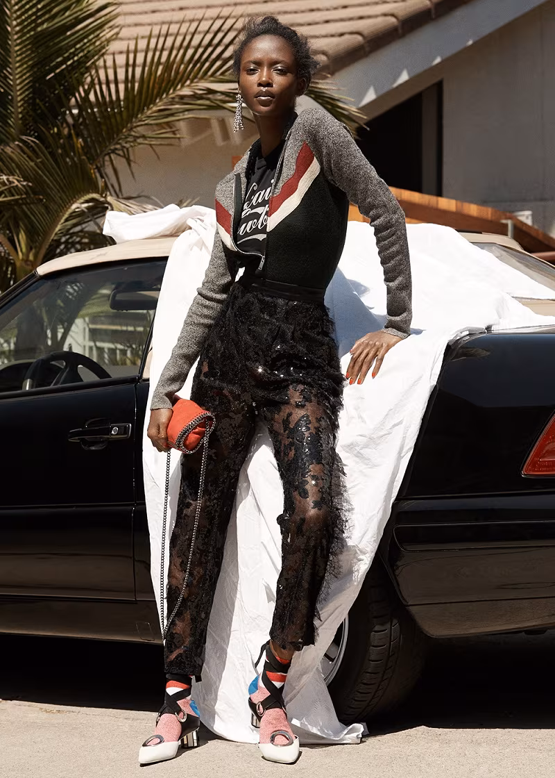 Isabel Marant Etoile Dawson After Ski Sweater, R13 Cocaine Cowboy Baby Tee, Rodarte Sequin Trousers with Side Seam Ruffle Detail, Proenza Schouler Grommet Leather Heels, Stella McCartney Falabella Crossbody, Lanvin Drop Earrings