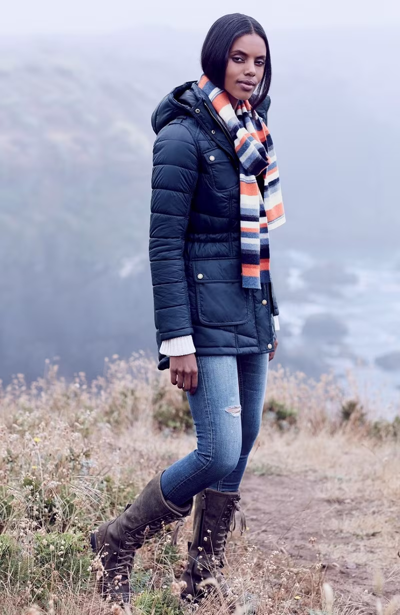 Barbour Circlip Water Resistant Quilted Coat, Barbour Briggs Stripe Lambswool Scarf, Strom Tio Ankle Skinny Jeans, Timberland Wheelwright Lace-Up Boot