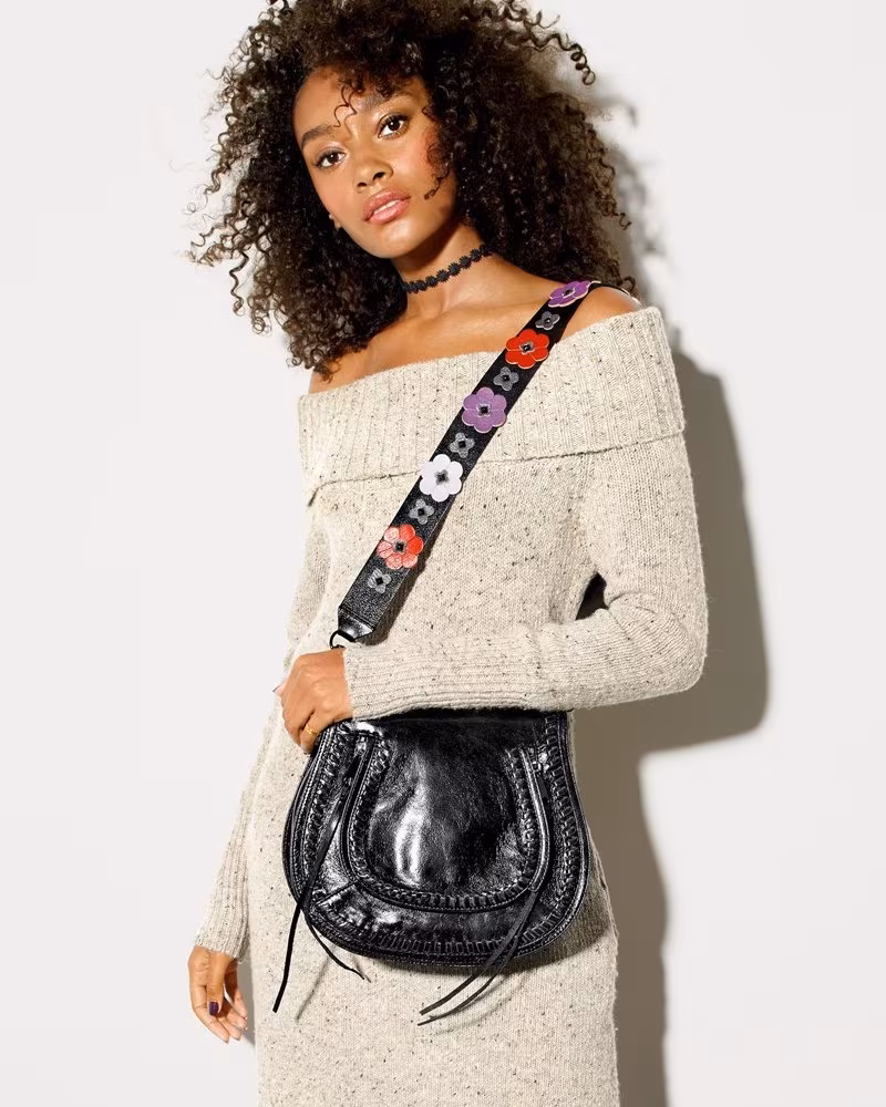 Rebecca Minkoff Vanity Saddle Bag, Rebecca Minkoff Floral Appliqué Leather Guitar Bag Strap, Rebecca Minkoff Erid Off the Shoulder Sweater Dress