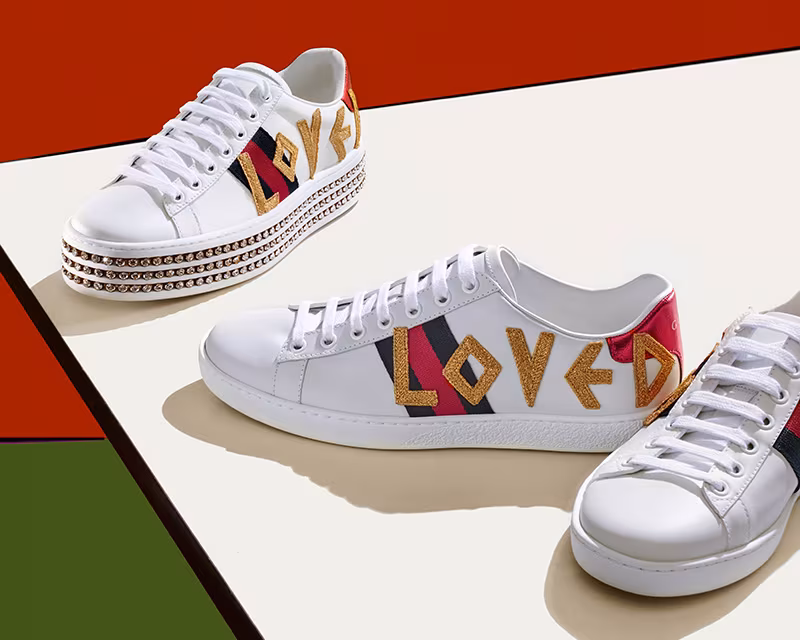 Score more than one solemate with this decadent shoes collection from Gucci Cruise 2018, this season is all about embroidered or sparkles, so you could find gold metallic sokc booties and glitter sneakers.