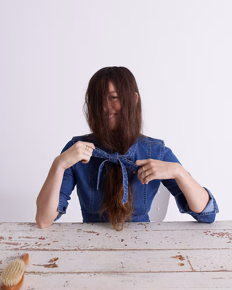 Madewell Denim Tie-Neck Shirtdress, Madewell Double Ring, Madewell Ceremony Circle Ring, Madewell Soundloop Stacking Ring Set