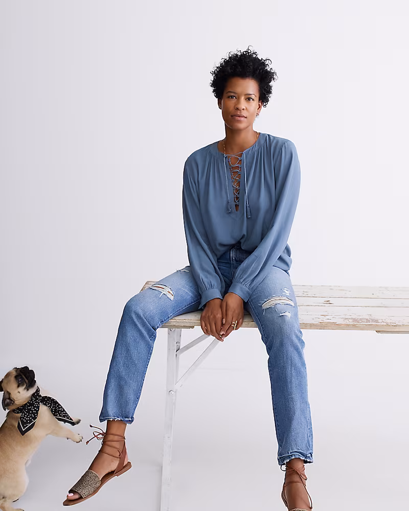 Madewell Lace-Up Peasant Top, Madewell The Perfect Vintage Jean In Chet Wash: Distressed Edition, Madewell Pavé Cuff Bracelet Set, Madewell Double Ring, Madewell Silk Bandana