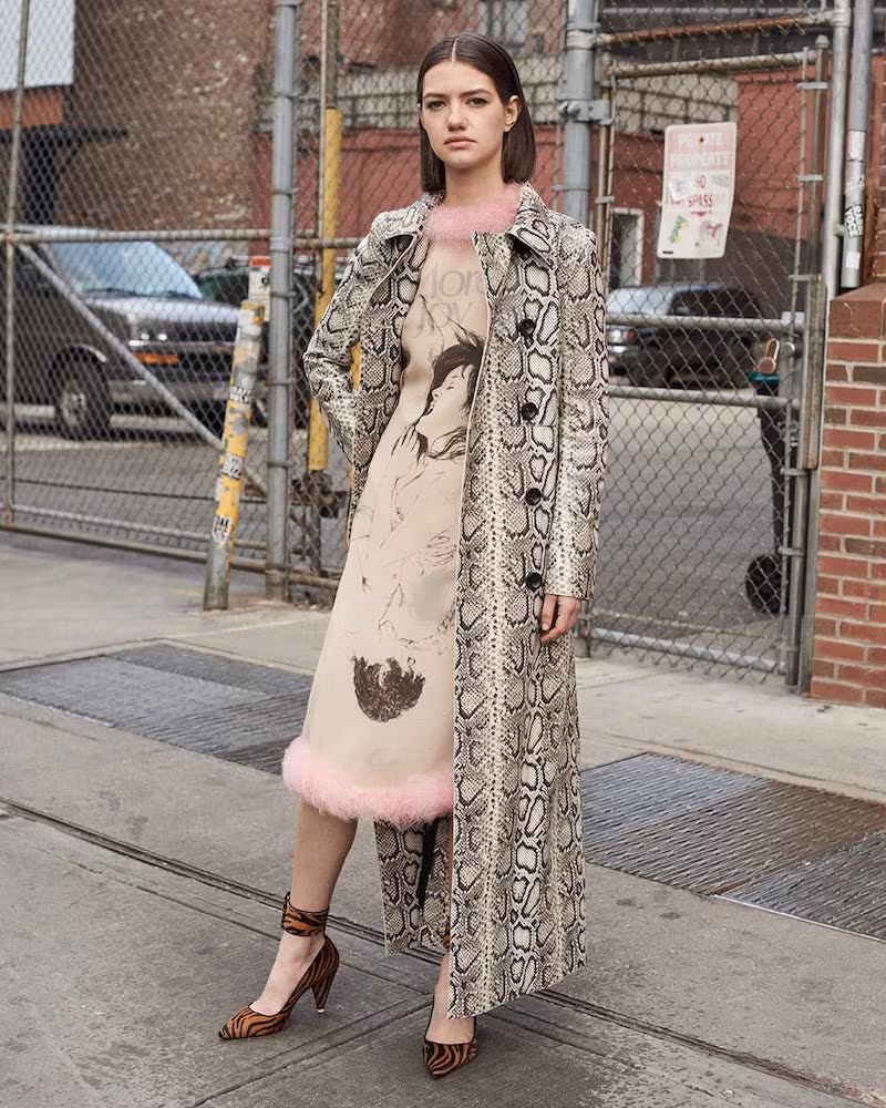 Kwaidan Editions Python-Print Leather Coat, Christopher Kane Feather-Trimmed Printed Silk Dress, Attico Zebra-Print Mid-Heel Shoes