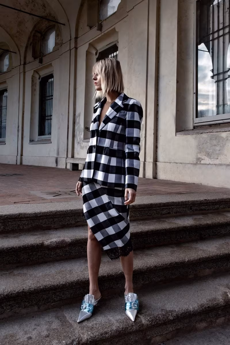 Altuzarra Fenice Wool-Blend Blazer, Altuzarra Vichy Lace-Trimmed Checked Wool-Blend Skirt, Midnight 00 Crystal-Buckle PVC and lamé Pumps