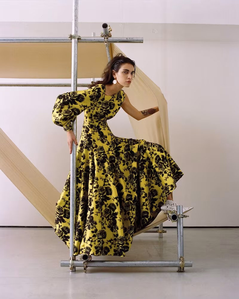 Junya Watanabe Comme Des Garçons Mixed Print Satin and Linen Dungaree Dress, Maison Margiela Mesh Bodysuit, Erdem Rafaella Crocodile-Effect Leather Pumps, Albus Lumen x Ryan Storer Shell-Drop Mismatched Hook Earrings
