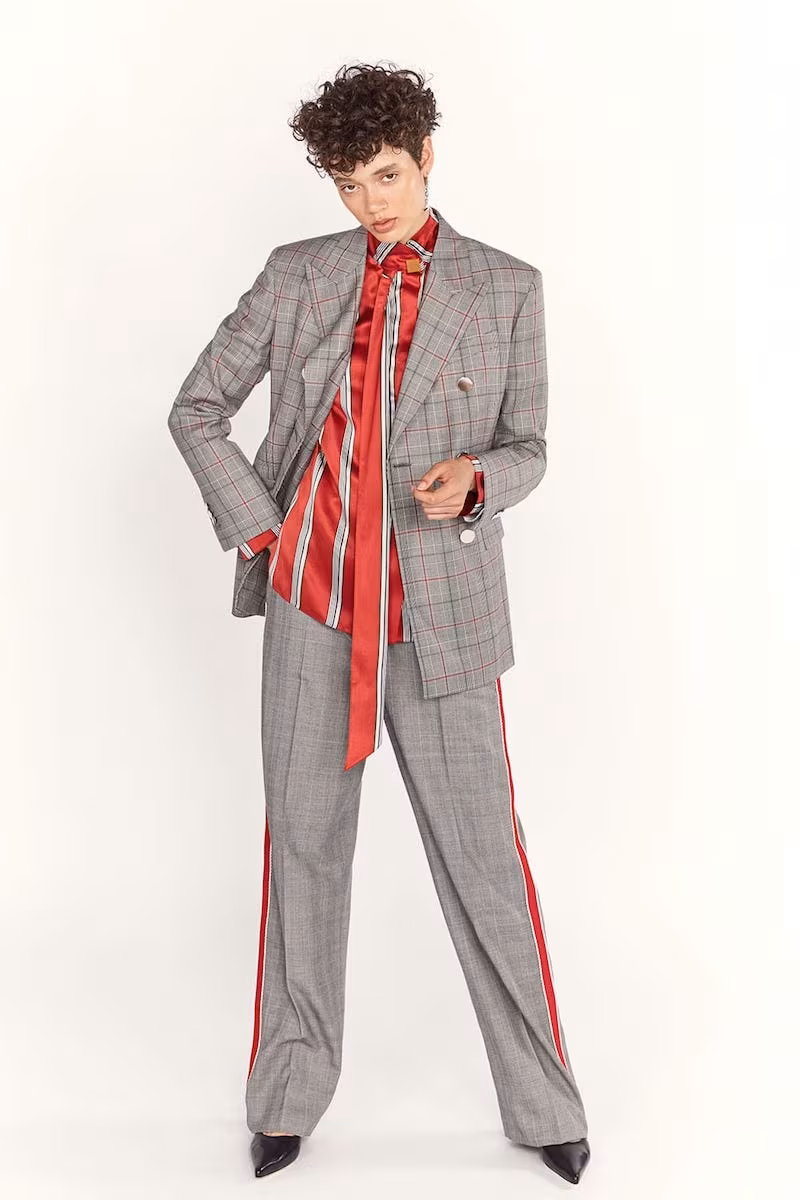 Gabriela Hearst Angela Checked Silk and Wool-Blend Blazer, Gabriela Hearst Vesta Plaid Silk and Wool-Blend Wide-Leg Trousers, Balenciaga Sweatshirt-Detail Checked Cotton Shirt, Toga Cross-Strap Checked Wool Flats, JW Anderson Perspex Knot Earrings