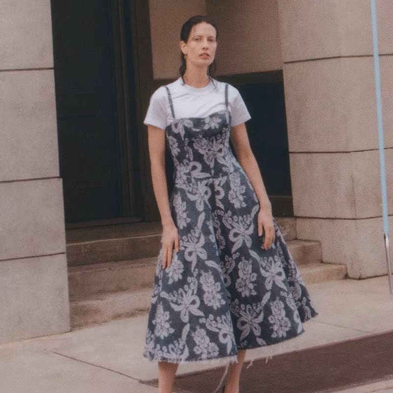 Junya Watanabe Crew-Neck Cotton Jersey T-Shirt, Junya Watanabe Floral-Embroidered Denim Dress, Loewe Ruched Leather Pumps, Hillier Bartley Gold-Plated Chain Earrings