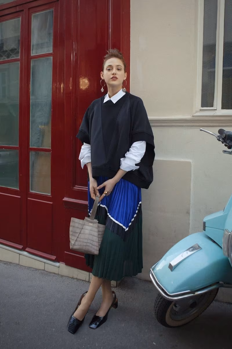 Givenchy Couture Sweatshirt, Sportmax Diretta Shirt, Self-Portrait Pleated Skirt, BY FAR Danielle Lizard Embossed Leather Slingbacks, Max Mara Leather Small Tote Bag, Alexander McQueen Shell Earrings, Charlotte Chesnais Petal Ring