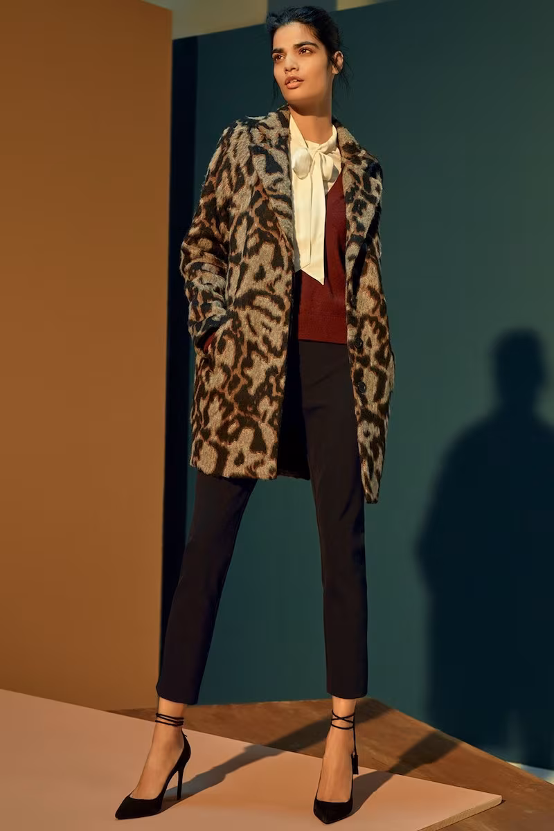Veronica Beard Camille Leopard Jacquard Cocoon Coat, Veronica Beard Arrow Tie Neck Cashmere Sweater, Veronica Beard Scuba Pants, Joie Angelynn Lace-Up Pump