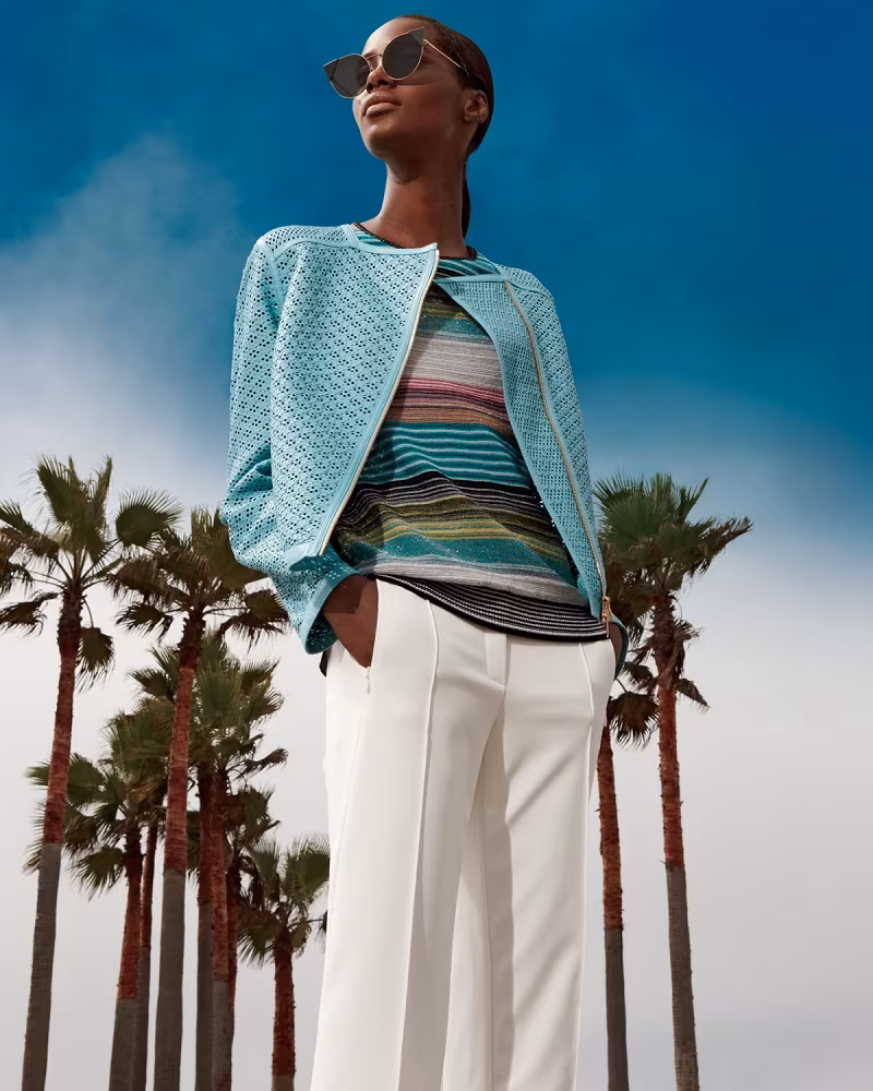 Escada Perforated Leather Moto Jacket, Escada Striped Cap-Sleeve Knit Sweater, Escada Tusko Straight-Leg Ankle Pants