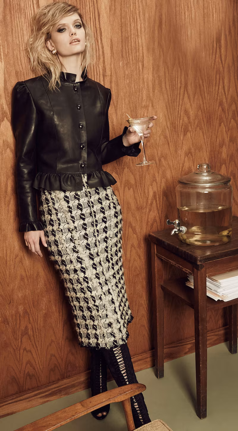 J.W. Anderson Ruffled Leather Jacket, Frame Denim Le Chiffon Tie Blouse, Rochas Tweed Wool Pencil Skirt, Giambattista Valli Lace Up Knee High Boots