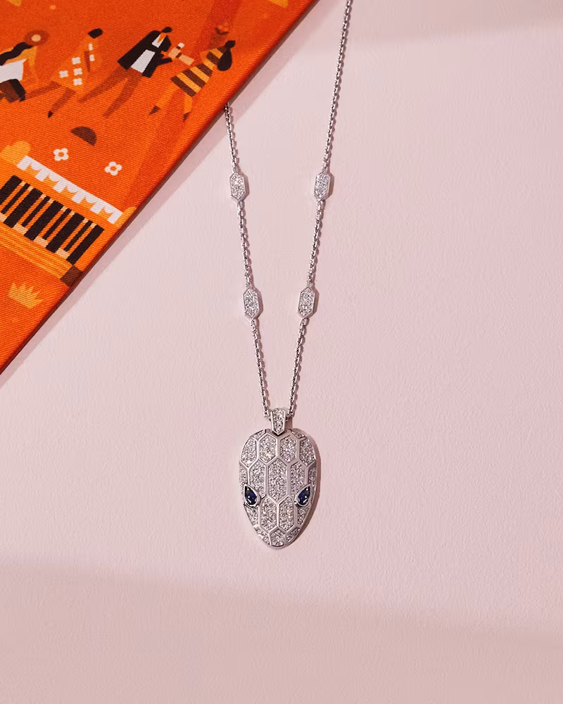 Bulgari Shelley Roma Heritage Silk Scarf, Bulgari Serpenti 18kt White-Gold, Sapphire and Diamond Necklace