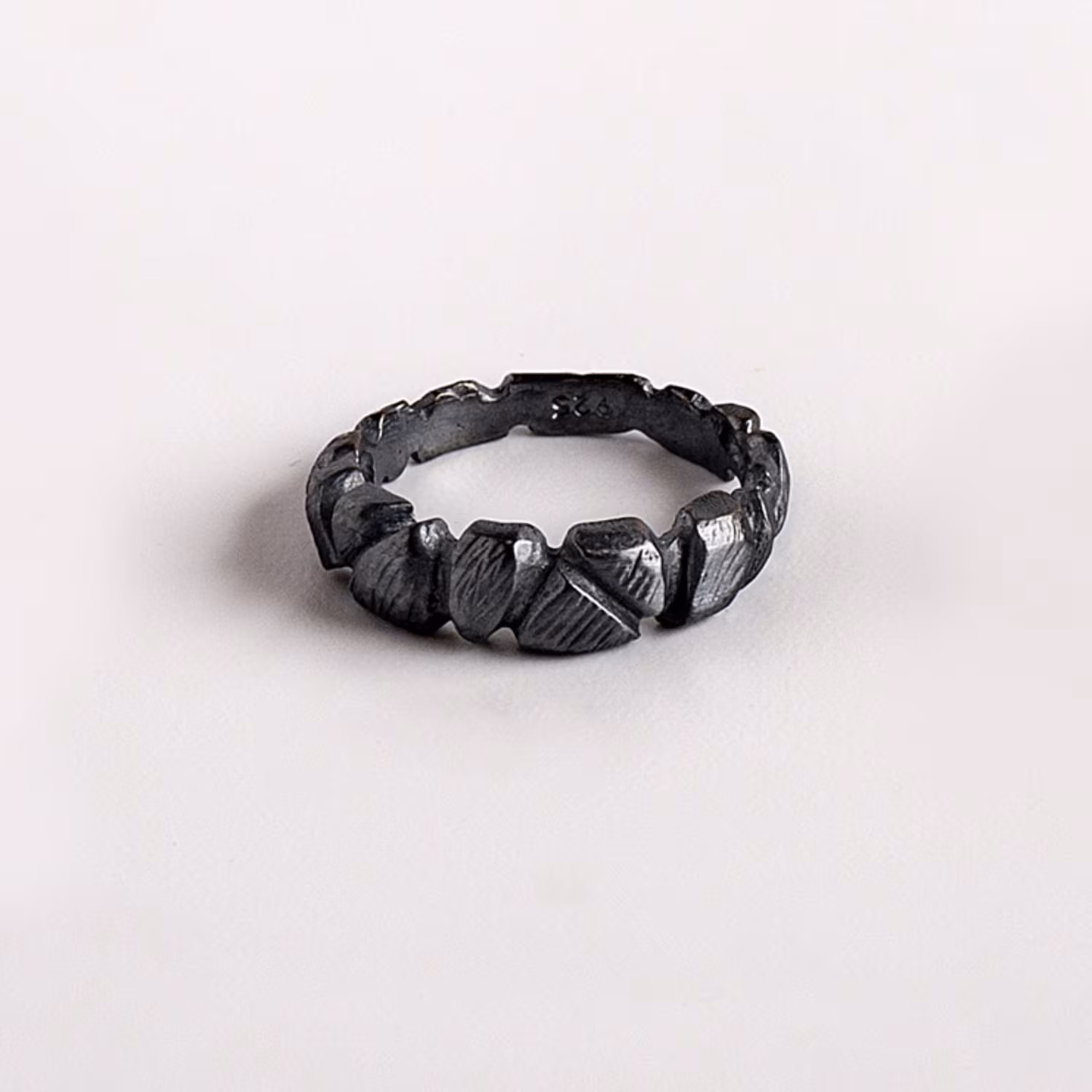 Faceted stone nuggets and sterling silver in a rough texture come together to create the elegant and essential Rocks Ring . This hand carved rustic ring shows a row of tiny rough stones. It's a detailed but slim ring, a perfect addition to your stacking ring set.