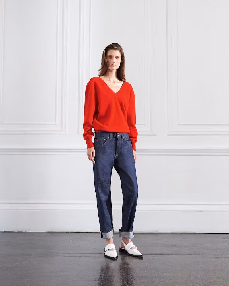 For her fourth pre-collections, Victoria Beckham Resort 2016 collection included new jeans made from premium Japanese raw denim in two cuts. And you can also find the experiments with sequins and lace. Of course, the main theme—asymmetry.